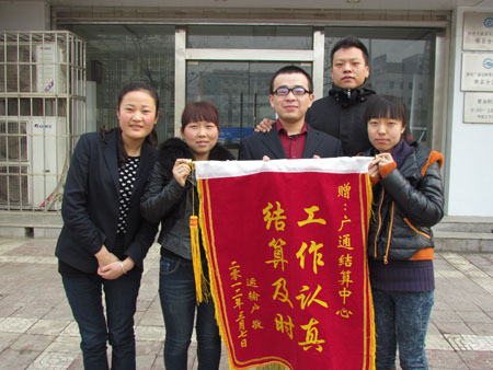 送來錦旗的運輸戶姓焦,2月底的一天,因為自己的疏忽不慎將一份結算票據遺失。其實他早已認定丟失的票據已被他人結算兌現。不過,令他意外的是3月2日,當他到彬縣分公司結算中心結算運費時,結算員郭寶銳將丟失的結算票據交還給了他。拿著失而復得的票據,焦師傅驚喜萬分。3月9日,焦師傅帶著錦旗與感謝信來到了彬縣結算中心。